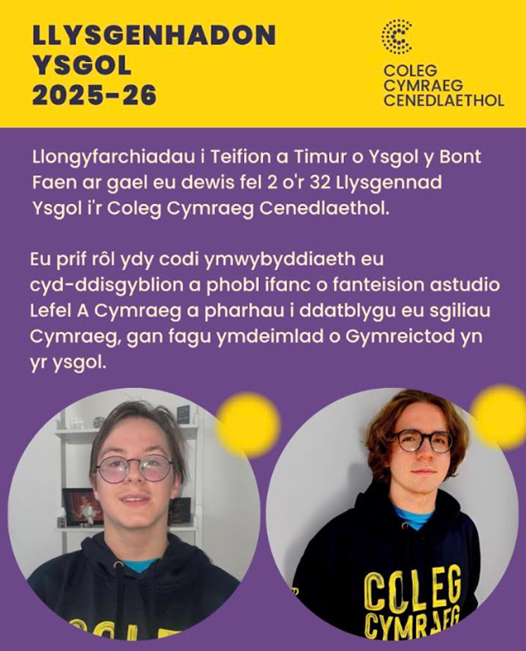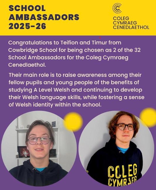 We are delighted to announce that two Cowbridge School students have been selected as two of the 32 School Ambassadors for the Coleg Cymraeg Cenedlaethol. This is a significant and highly competitive achievement, reflecting their dedication to their studies and their commitment to promoting the use of the Welsh language.