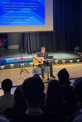 Following the fantastic achievement of our Year 11 pupils in winning a Wales-wide quiz on Dydd Miwsig Cymru, we were thrilled to receive a special prize — a visit from renowned singer-songwriter Mei Gwynedd!